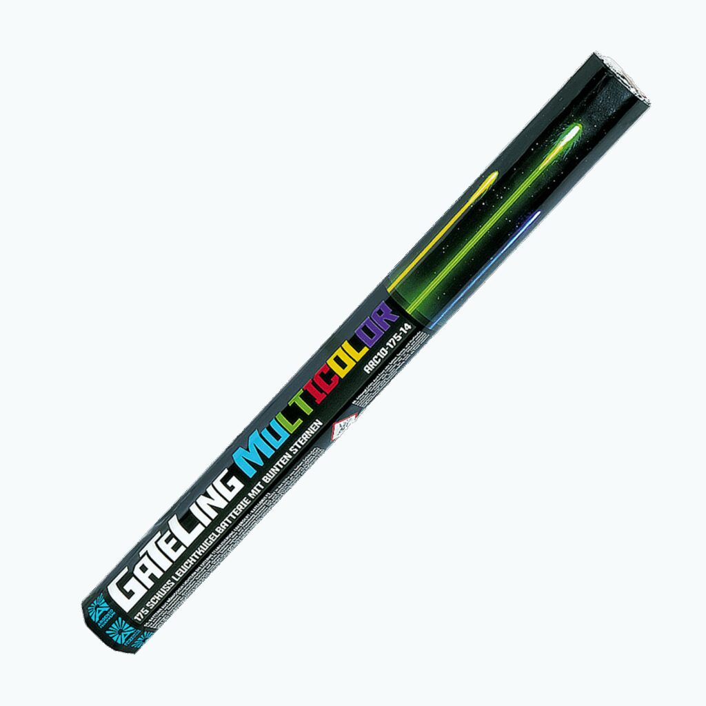 n n175-schots flare batterij met kleurrijke sterren. Verkrijgbaar in verschillende kleuren en effecten, voor gebruik in shows etc. n n Argento Vuurwerk GaTeLing Multicolor Goedkoop vuurwerk kopen bij Vuurwerkwinkel Apeldoorn