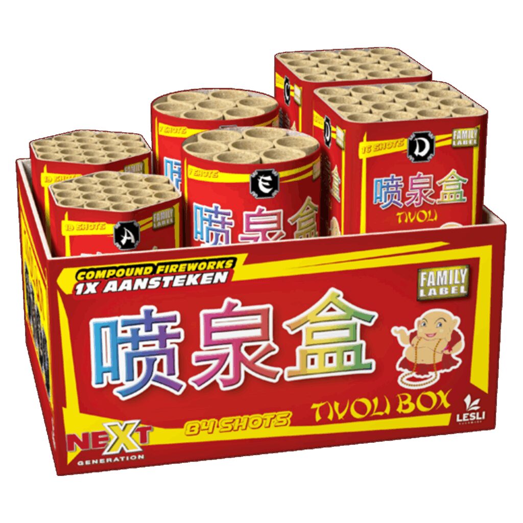 n nCompound van 6 batterijen met verschillende kalibers. In totaal 84 schoten, 1 keer aansteken! n n Lesli Vuurwerk Tivoli 84 shots Goedkoop vuurwerk kopen bij Vuurwerkwinkel Apeldoorn