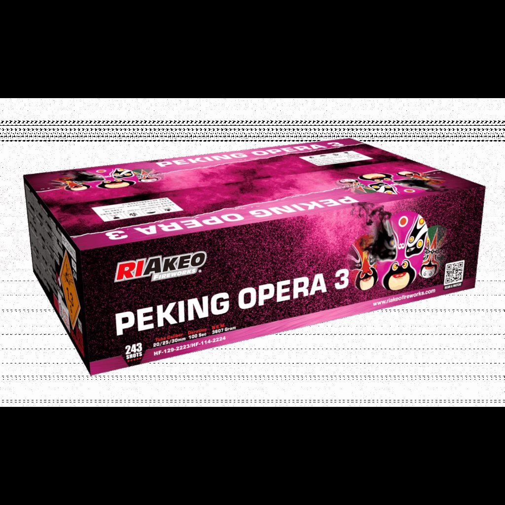 nDe Peking Opera 3 van Riakeo is een dubbele compound.n243 schoten afgevuurd in kaliber 20/25/30mm en net geen 3,9kg NEM!!nEffecten:nVerschillende effecten zoals gouden wilgen, flashers of cracklin palms met een krachtige knallende bloemenfinale.nDit product is verboden in Nederland.