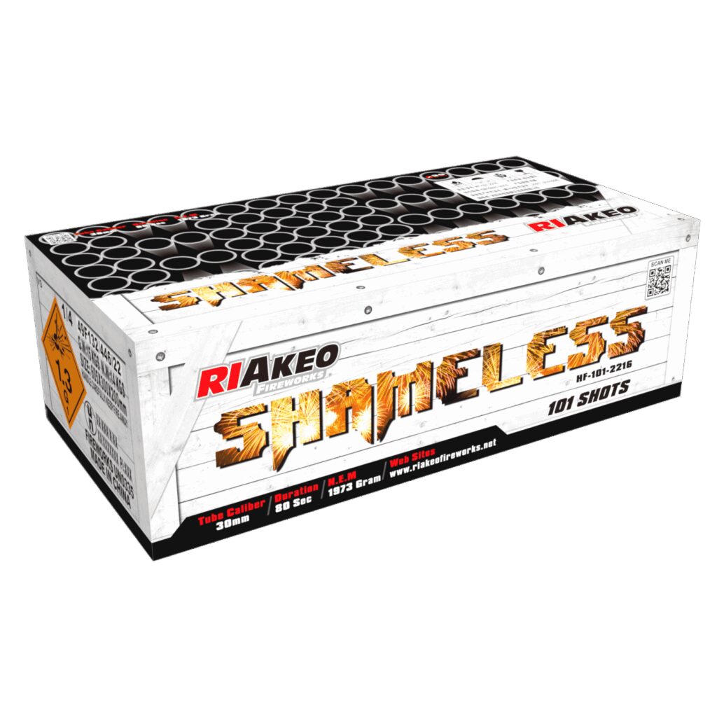nDe Shameless van Riakeo is een 101 schots compound met bijna 2 kg NEM n30mm shots in waaier: I Shape, Z Shape of W Shape.n nEffecten:n nHoogwaardige premium effecten zoals: nDiverse gouden effecten, flasher boeketten met kleurrijke dahlia’s of Crackling Chrysanthemum zijn slechts drie van de exclusieve effecten in deze hoogwaardige composiet.n nDit product is verboden in Nederland.