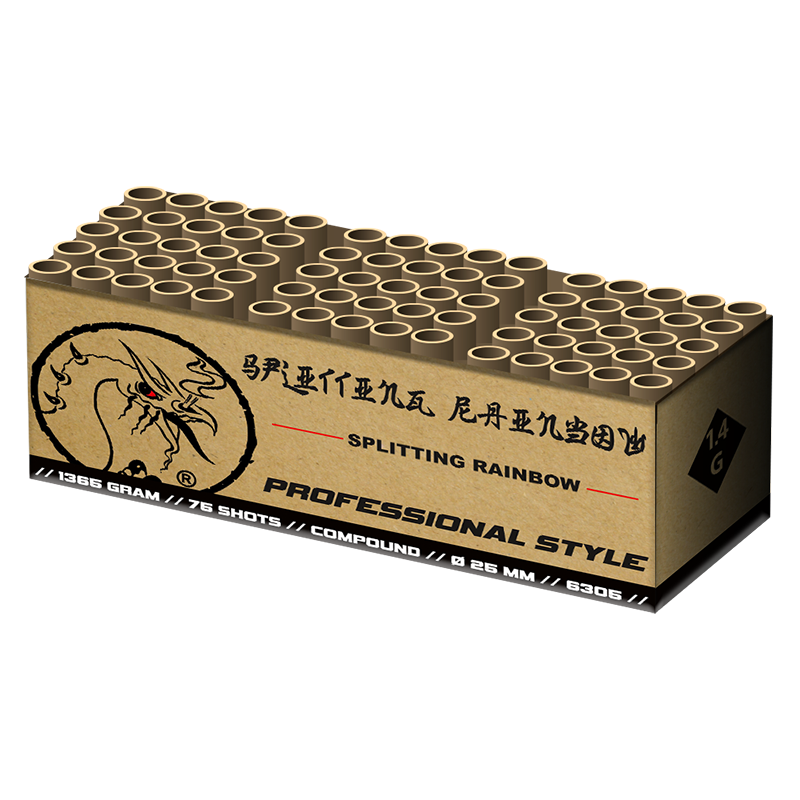 Splitting Rainbow 75 shots 25mm. Dit is een echte compound voor de vuurwerkliefhebber. Op verzoek van vele heeft Professional Style deze Crossette-compound speciaal voor de Nederlandse vuurwerkliefhebbers ontwikkeld. Met heerlijk heldere gouden staarten stijgen felgekleurde lichtkogels hoog de hemel in. Wanneer de lichtkogel zijn maximale hoogte heeft bereikt, splitst de lichtkogel zich op in vier kleinere lichtkogels welke zich sierlijk in de breedte verder door de hemel verplaatsen. Uniek, sierlijk, en ook nog eens low-noise! Aanrader!
